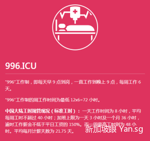 “‘996’工作制,即每天早9点到岗,一直工作到晚上9点,每周工作6天。‘996’工作制的周工作时间为最低12×6=72个小时。”(摘自996.ICU)