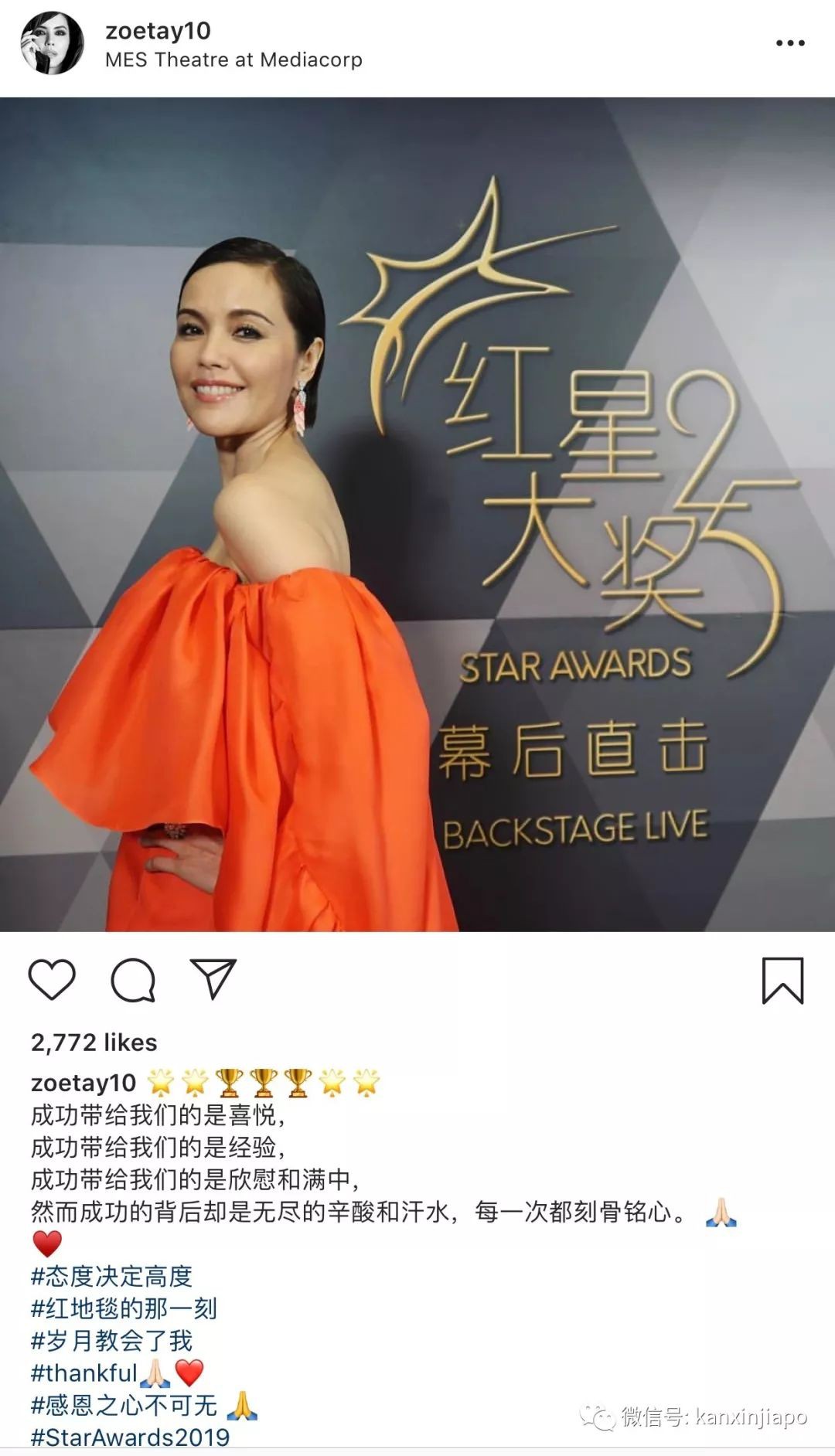 在昨晚的典礼上,视帝视后的桂冠分别由新加坡“阿哥”陈汉玮和“阿姐”郑惠玉摘得。她还在Instagram上发文,感谢观众一路以来对自己的支持。