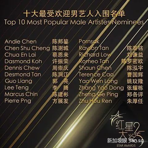 今年的“十大最受欢迎男艺人”,是十大最受欢迎男艺人是陈泓宇、陈罗密欧、方展发、郑各评、 朱厚任、Pornsak、陈泂江、周崇庆、许振荣和陈澍城。