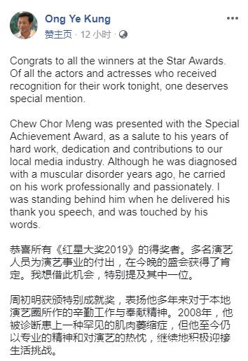 连新加坡政要人士,教育部长王乙康也受邀出席了典礼,并为周初明颁发“特别成就奖”。