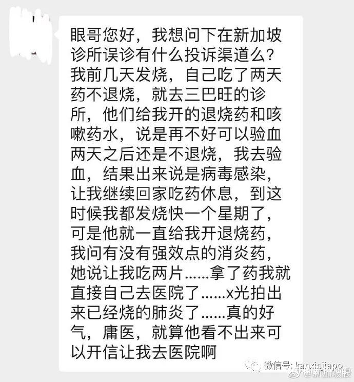 新加坡眼收到网友求助:“在新加坡的诊所看病,本来是简单的发烧咳嗽,结果被医生耽误了,都烧成肺炎了……诊所误诊,耽误病情有什么投诉渠道?”