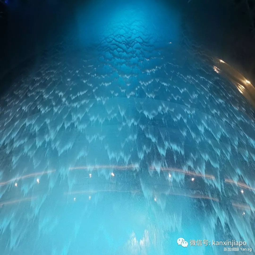 再来近距离感受下这个全世界最大的室内瀑布,灯光投射把水的波纹折射得层层叠叠,别有一番趣味: