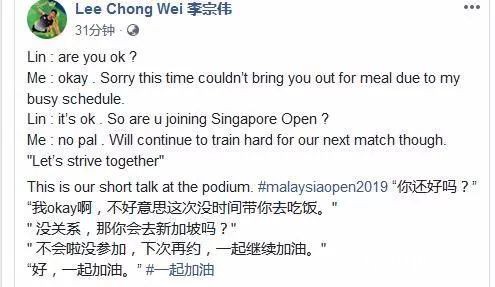 不过事后李宗伟在个人脸书上贴出了他们的谈话内容,原来这二人约好了一起努力,争取东京再战。