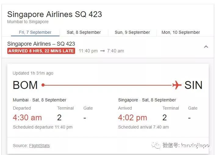 这班飞机原定于昨天当地时间晚上11点40分起飞(新加坡时间凌晨2点10分),结果却延误到今天当地时间早上7点50分才起飞,延误了将近8个多小时。