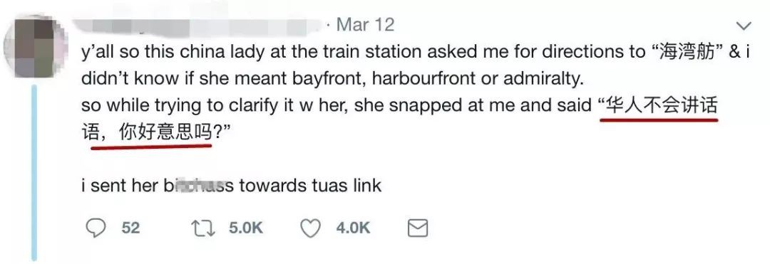 翻译:YO,一位女士在地铁站问我:“海湾舫怎么去?”,我没太听明白她想去哪,就问她是想去bayfront还是harbourfront还是admiralty,然后她就发飙了,跟我说:“华人不会讲华语,你好意思吗?”气得我直接给这货指到大士去了。