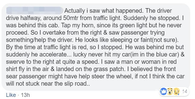 德士上还有3名乘客,他们在危急情况下自救:控制方向盘、开启警示灯、摇下所有车窗提醒他人小心,但还是没能阻止这场悲剧。