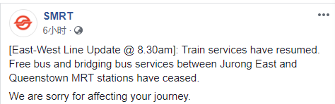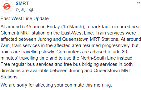 SMRT事发后在脸书上发贴文解释:事件是由金文泰地铁站附近的轨道故障引起。