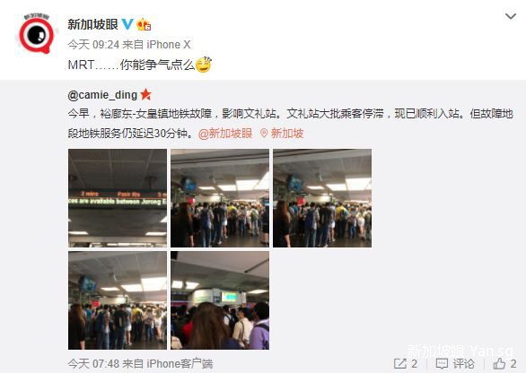 早上7点多,就有网友在微博艾特眼哥,说裕廊东至女皇镇之间的地铁出故障了,地铁服务延迟30分钟…