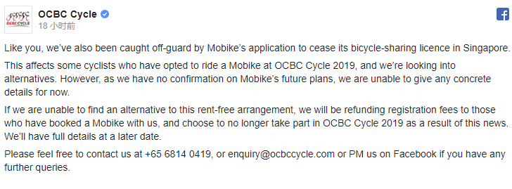 华侨银行将在今年5月举办“骑车乐”自行车大会,摩拜本应为骑手们免费提供大约500辆摩拜自行车,但现在摩拜突然退场,让大会主办颇为措手不及。