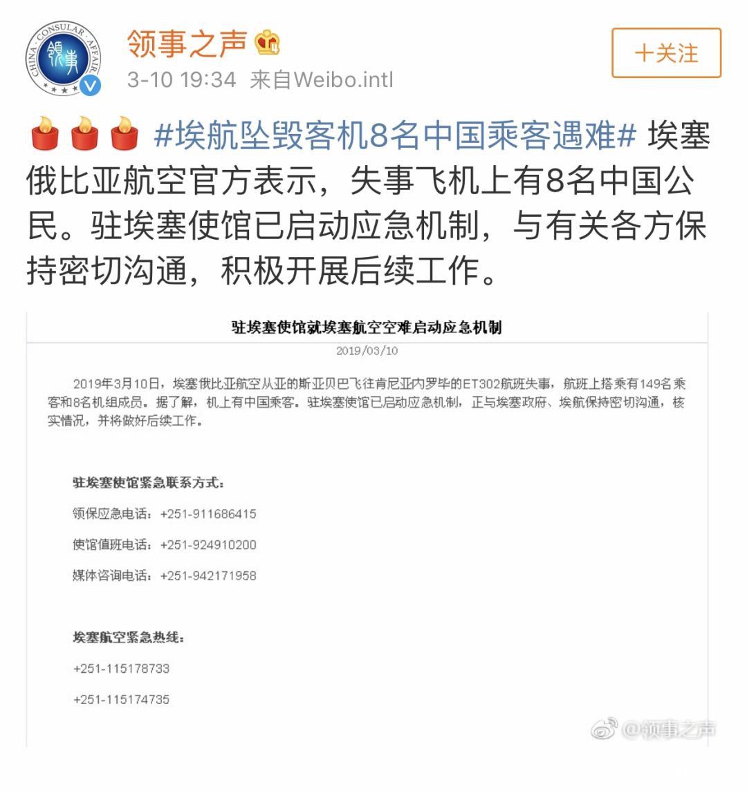 今天(3月10日)上午,埃塞俄比亚航空公司的客机坠毁!乘客与机组人员157人全部遇难!其中有8名中国公民,5男3女。