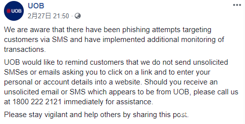 上个月27日,大华银行在Facebook发帖,表示了解到有人收到不法之徒通过手机短信发送的钓鱼链接,他们将因此对交易加强监控。