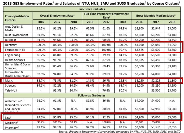 从学科大类(institution clusters)来看,艺术、设计与媒体类专业薪水都很低,为3000新币,不过好歹比2017年的2944高,69.8%的就业率也不容乐观。