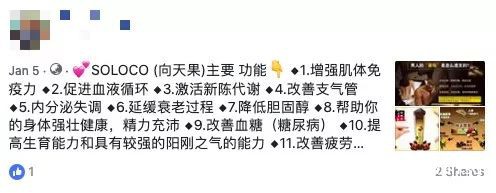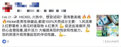 在Facebook上,还有人在为它们打广告,还把这些“糖果”写得特别神:两种产品的广告都把它们包装成了“纯天然植物配方”的保健品,除了激发活力壮阳之外,还可以改善心血管健康,解决“三高”,促进新陈代谢。