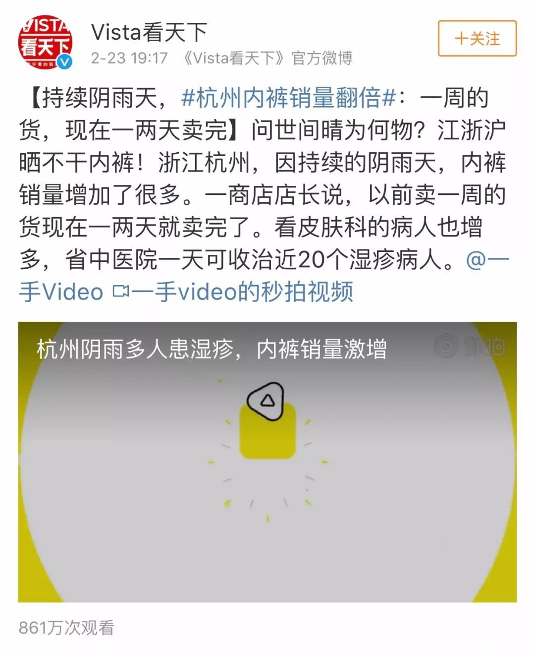 ”杭州内裤销量翻倍“ 也登上了微博的热门话题,人们苦中作乐,吟诗一首:”问世间晴为何物,江浙沪晒不干内裤“。满满的,都是心酸啊!
