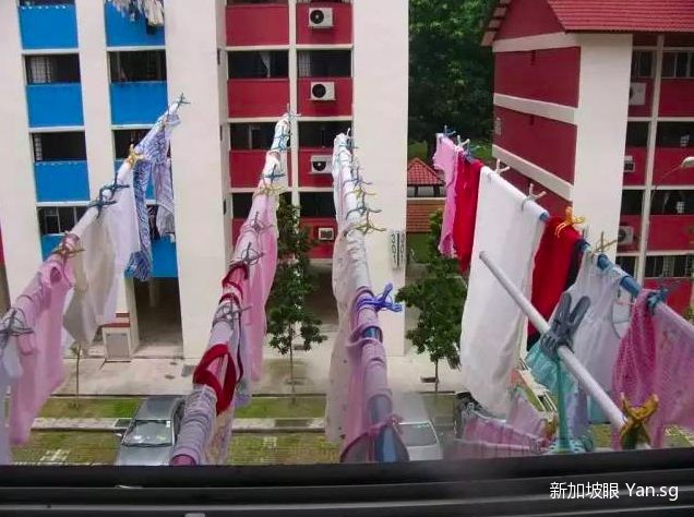 住在组屋的小伙伴们一定对”彩旗飘飘“的场景不陌生。新加坡的组屋通常没有阳台,所以在厨房外墙设置有晾衣架的洞口,供大家用竹竿挂上衣服伸出室外去晒。