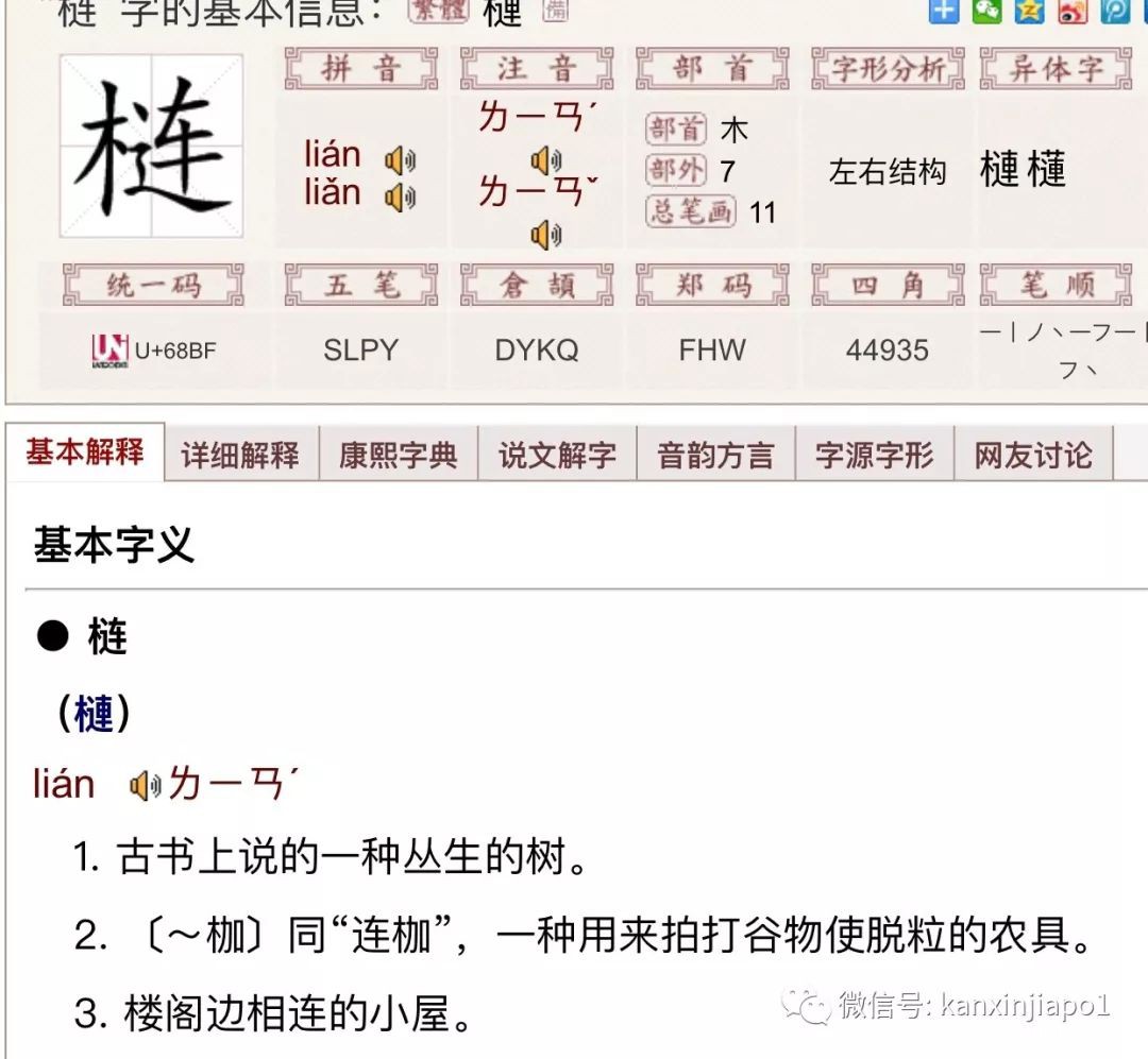 新加坡人:我们学的是木字旁的“梿”,这也是能在新华字典里查到的!