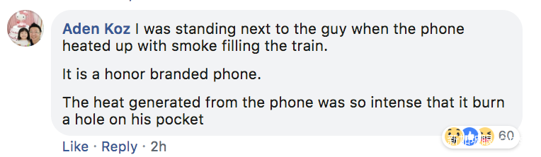 现场一位站在手机主人不远处的目击者说,事发时这名主人正在和友人聊天,突然他的后衣袋开始冒烟。于是他迅速把手机拿出来扔掉,可是口袋还是被烧出了一个洞,而他的手上也沾上了不少灰。