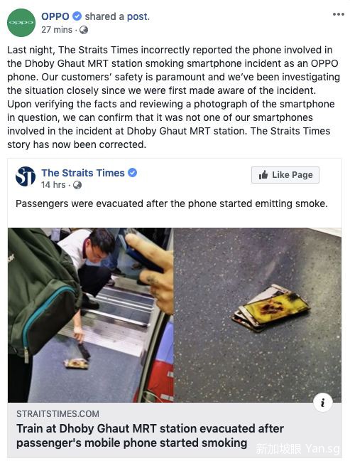 今天,Oppo官方脸书转载了新加坡媒体Straits Times的文章,并澄清:经过细致的调查得出结论,冒烟的手机并不是Oppo的哦!
