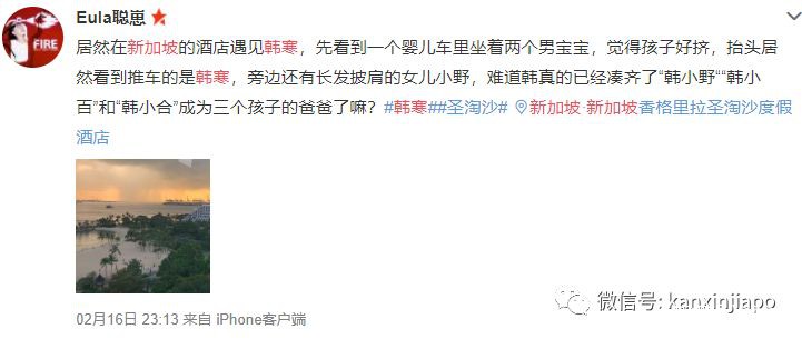 还有网友发微博称在圣淘沙遇到了韩寒,看来韩寒真的是来新加坡玩了。