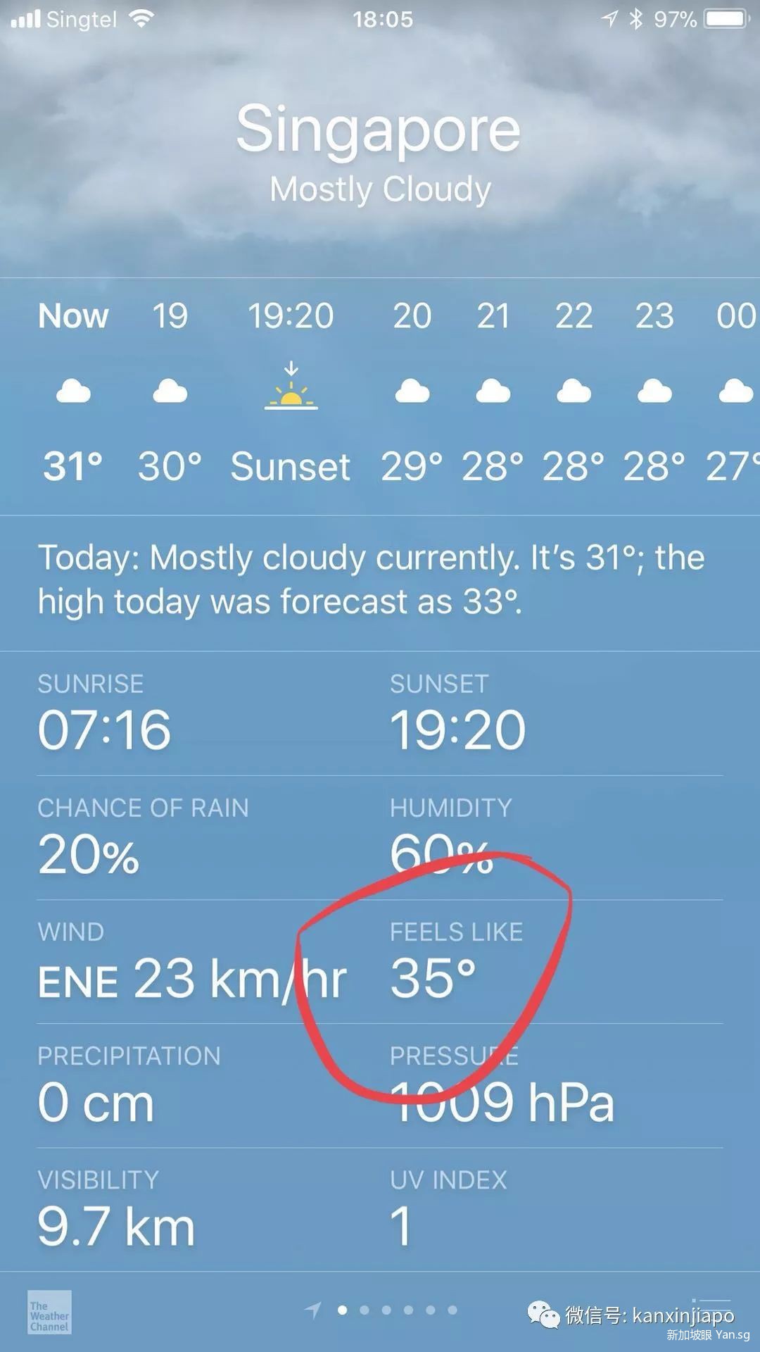 因为新加坡湿度高,空气里的水汽会依附皮肤,所以湿度高的地方热的时候感觉更热,冷的时候感觉更冷。比如北京与上海的户外,同样是零度,上海体感要冷很多,这就是湿度的影响。