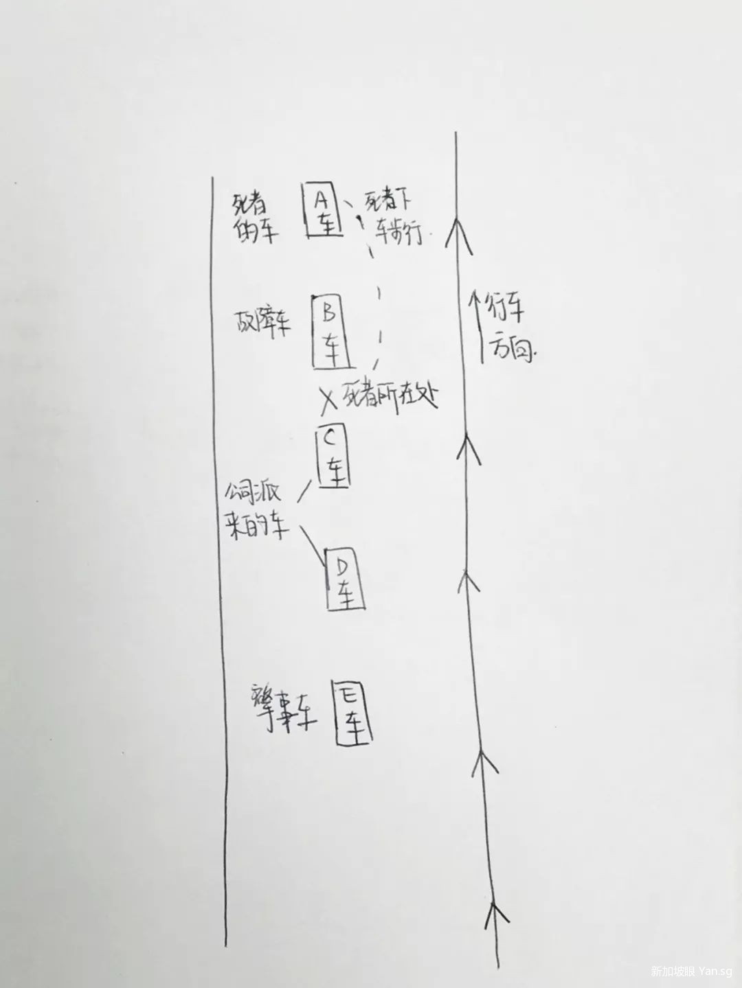 就在他们修车的时候,又一辆货车(E车)驶来,司机正是开头被判刑的那位大哥,就要经过车阵路段时,他发现打包的卤面滑到了脚边,于是弯腰捡面。