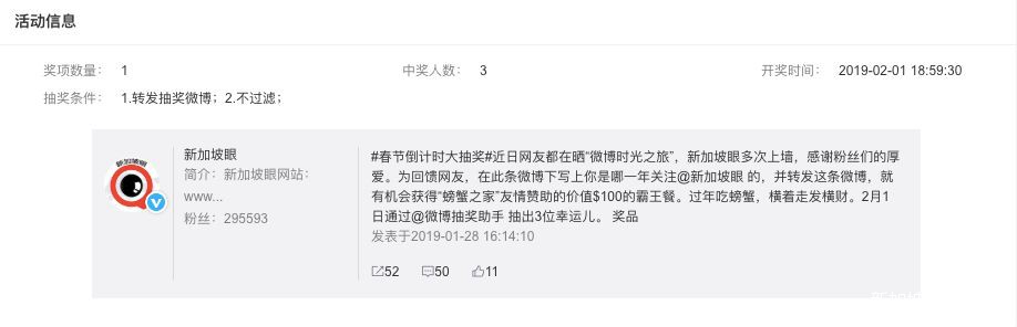 不过,在经历了2018的风霜之后,2019,幸运终于降临!刚一开年,新加坡眼使用抽奖平台选取的3位幸运儿中,就有他一个!他获得了螃蟹之家价值100新币的霸王餐!