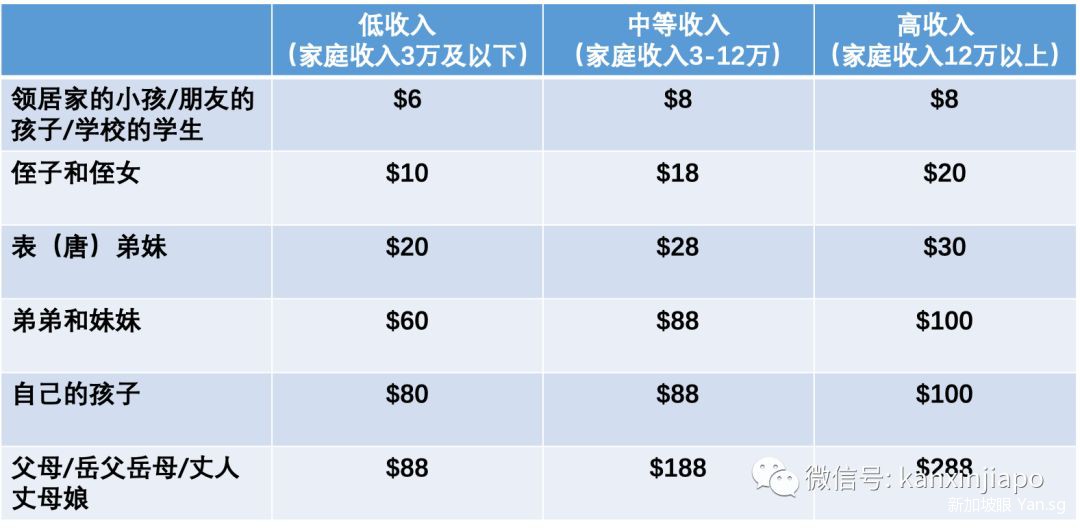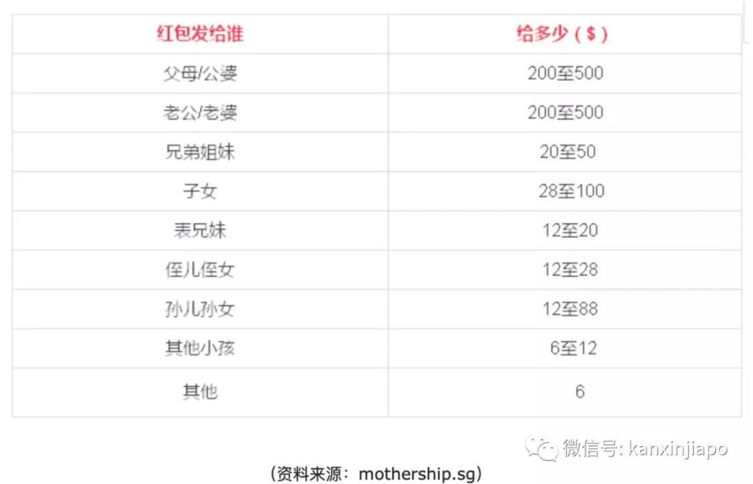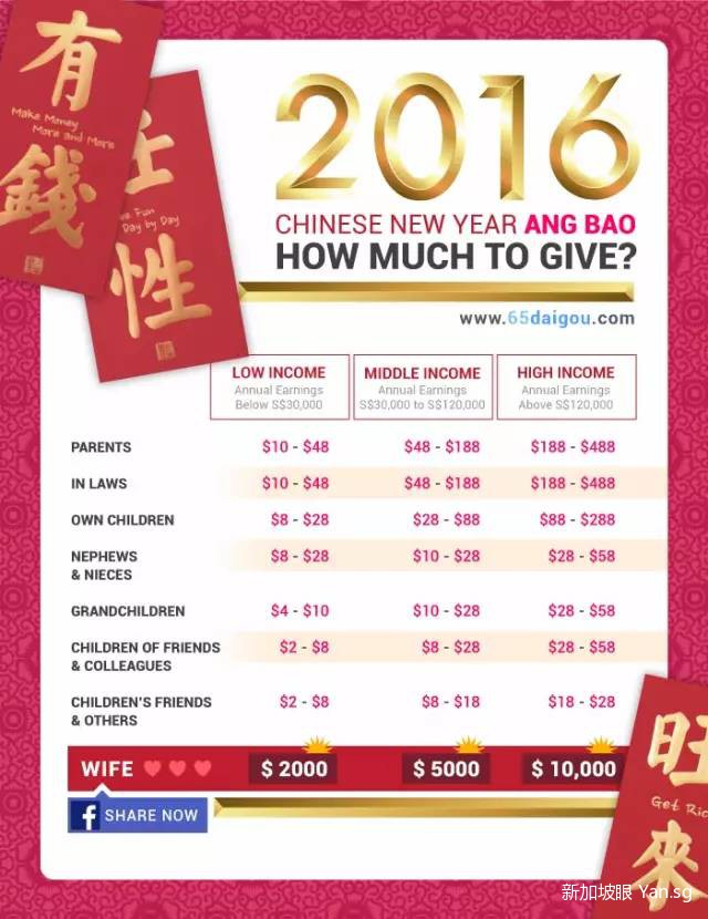 还有热心人士专门算了2016年的平均数:给父母的红包金额最大,平均389新币(真够精确的);其次是岳父岳母,232新币(说好的一碗水端平呢?);祖父母或外祖父母(181新币);亲戚的孩子(132新币),儿女(124新币)。