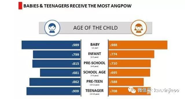 另外还有数据显示,在新加坡,不同年龄段收到的红包也有差别。从婴儿时期的近1000新币降到10岁时的588新币,青少年时期又有所上涨。