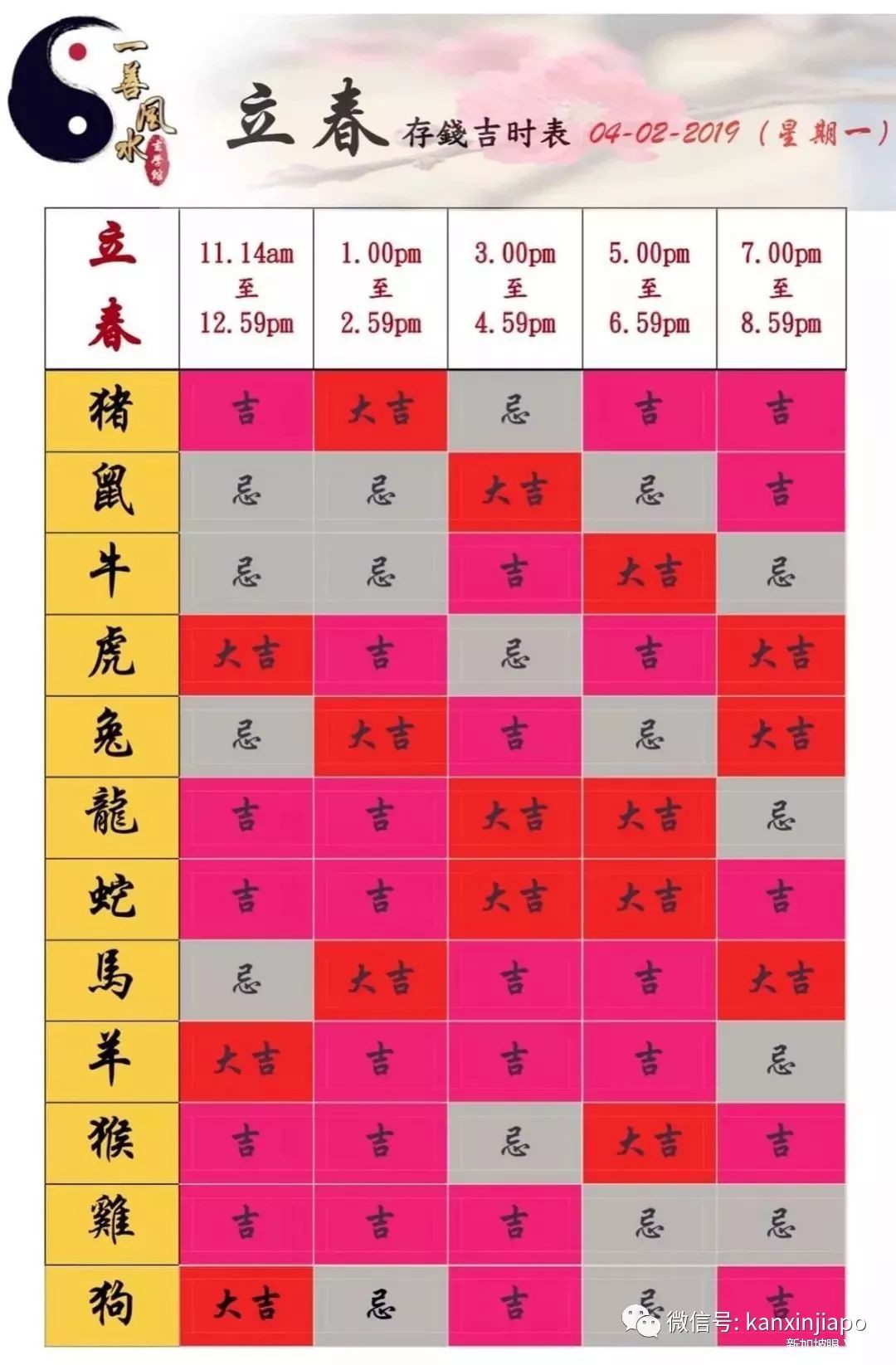 在这里为大家献上这张立春存钱吉时表:共分五个时段,最早是早上11:14,最晚到晚上8:59。
