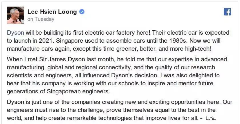 李显龙总理当时还专门在facebook上,表达了对戴森选址新加坡的展望和寄语。