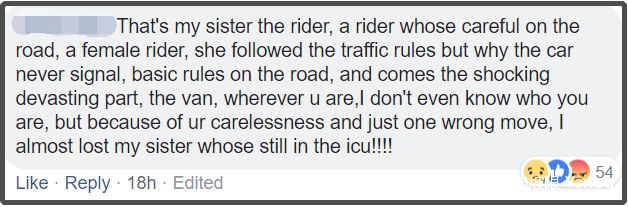 许多网友指责轿车司机违规驾驶,女骑士的姐姐也在Facebook帖子下面留言,责问轿车司机为什么在变换车道的时候不开信号灯。
