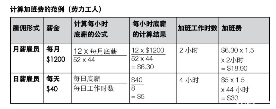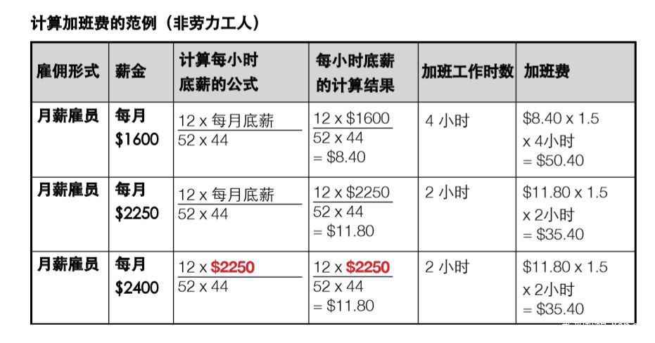 每月底薪低于$2,250的非劳力工人:1.5 x 加班工作时数 x (12 x 每月底薪) /(52 周 x 44 小时) 每月底薪为$2,250