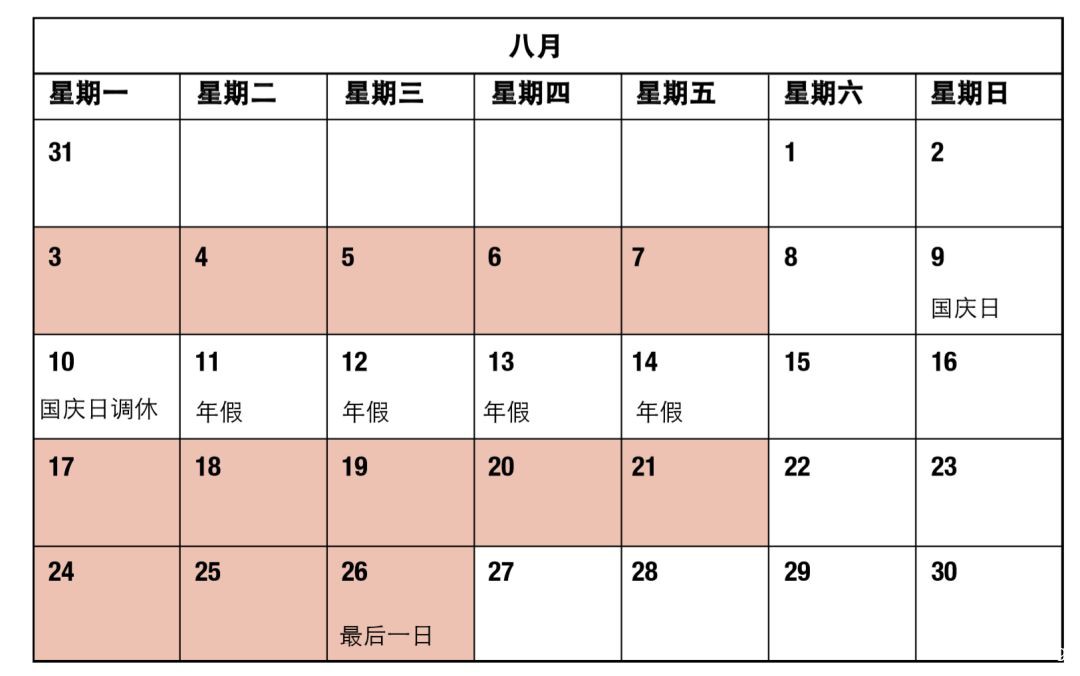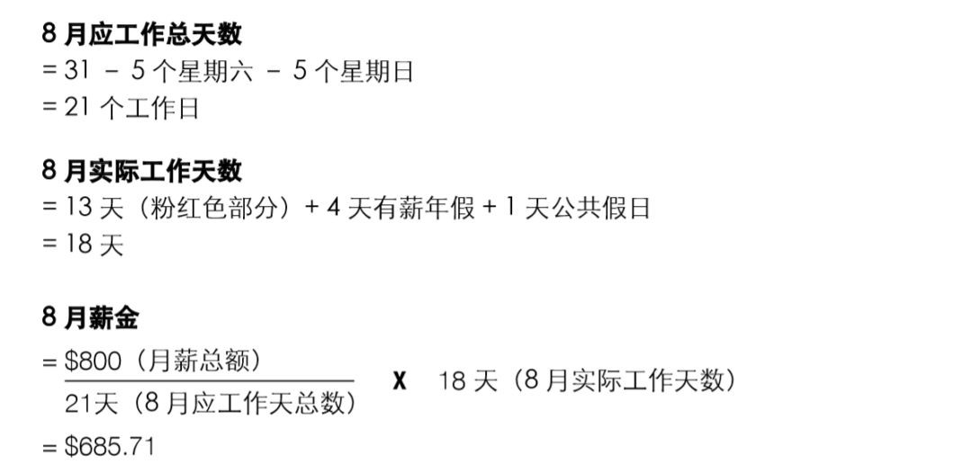 范例:如何计算工作时间不到1个月的薪金 泰明的工作是5 天制,从星期一到星期五,每月底薪是$700,月薪总额为$800。他 已经呈交了辞职信,最后一个工作日是8 月26 日。他在8 月11 日至14 日拿了4天的 有薪年假,星期天是泰明的休息日。
