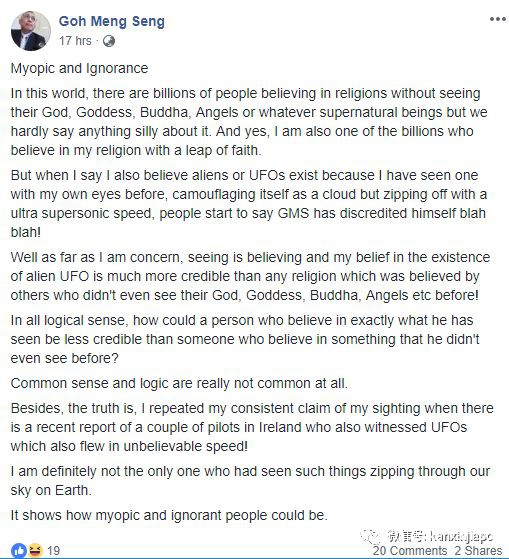 同样相信外星人存在的,还有新加坡著名前反对党领袖——吴明盛。他甚至自称见过UFO!