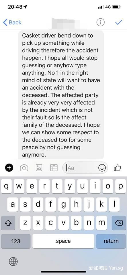 有人爆料称,整件事是灵车司机的过错。灵车司机疑似在驾驶的途中,突然弯腰在车内捡东西导致分心,才造成车祸。