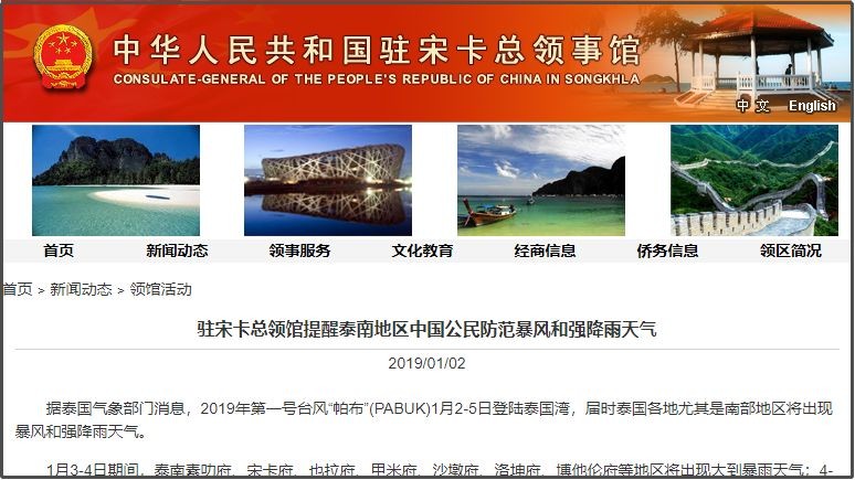 中国驻泰国宋卡总领馆于1月2日在官网发布通告,呼吁在泰国南部地区的中国公民及游客注意加强安全防范。