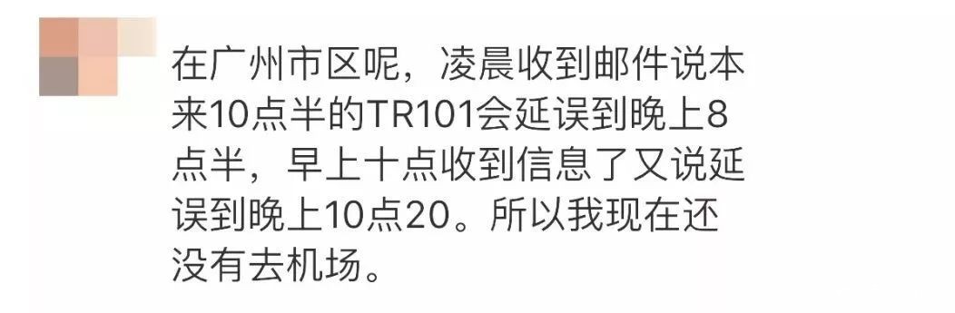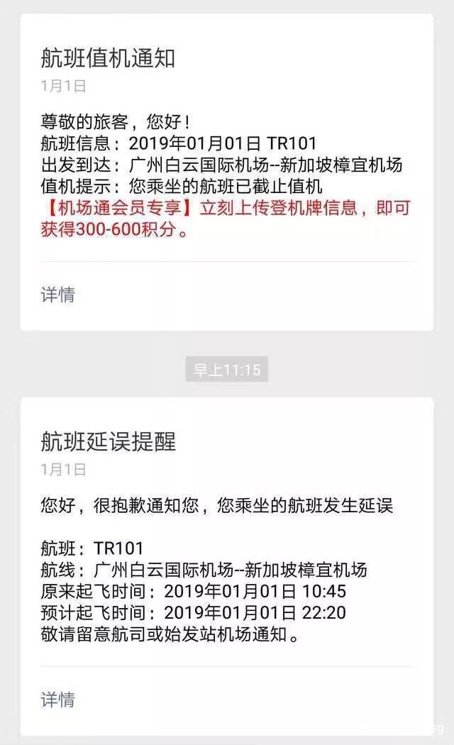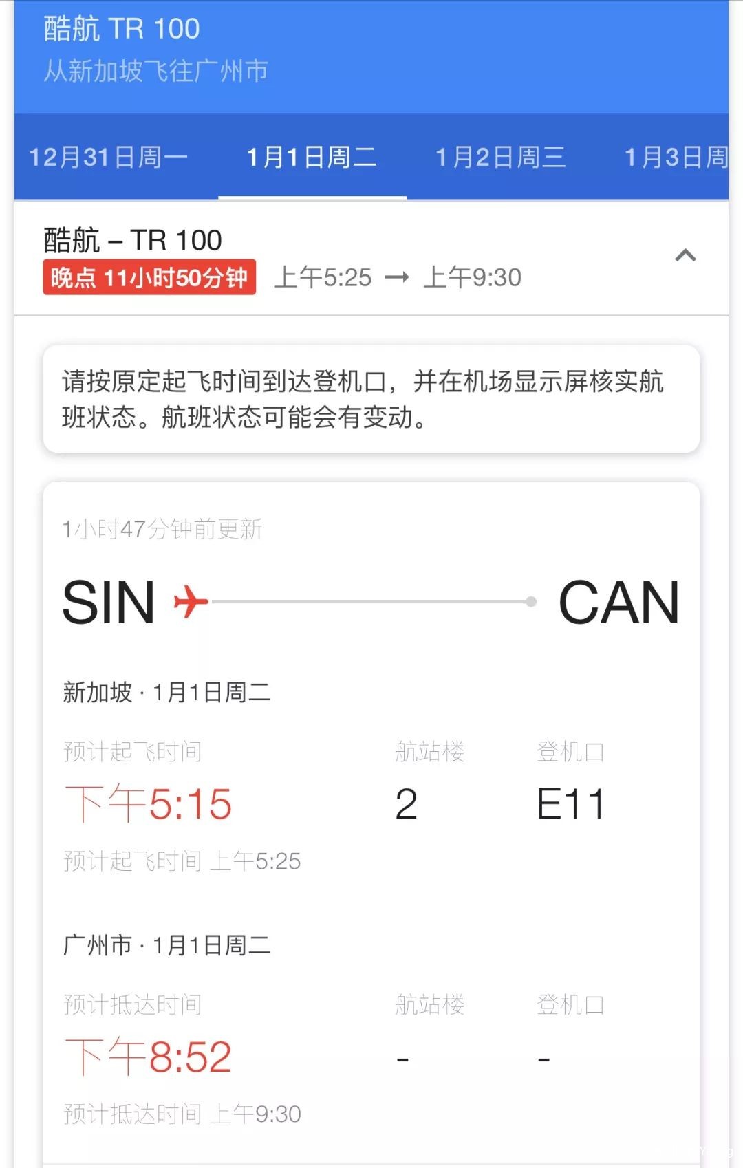 TR101的前序航班从新加坡飞往广州的TR100,显示晚点11小时50分钟。