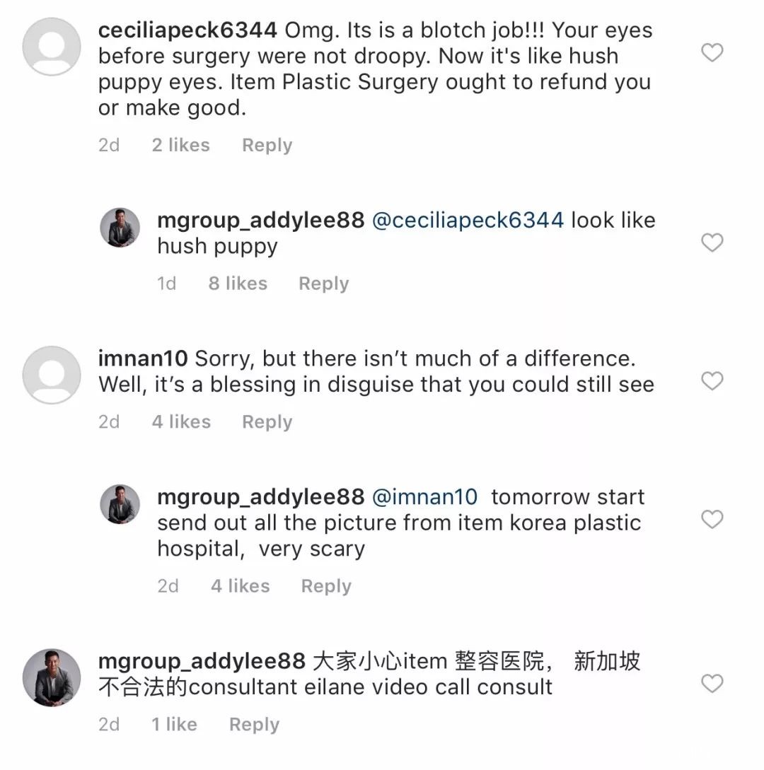 在他和评论区的网友的对话中,他愤怒地表示自己看起来像”hush puppies”中的巴吉度猎犬。(巴吉度猎犬以面部松弛著称)他还表示将会继续曝光这家名为“Item Clinic”的韩国整形医院。