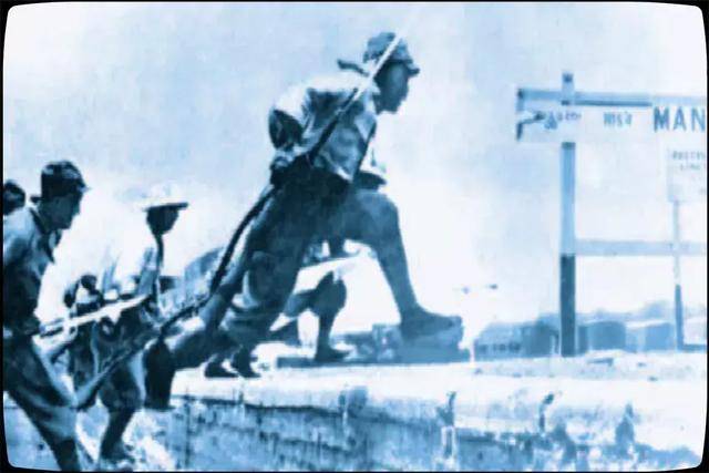 日军步兵在东南亚战争中占领缅甸曼德勒火车站的场面。