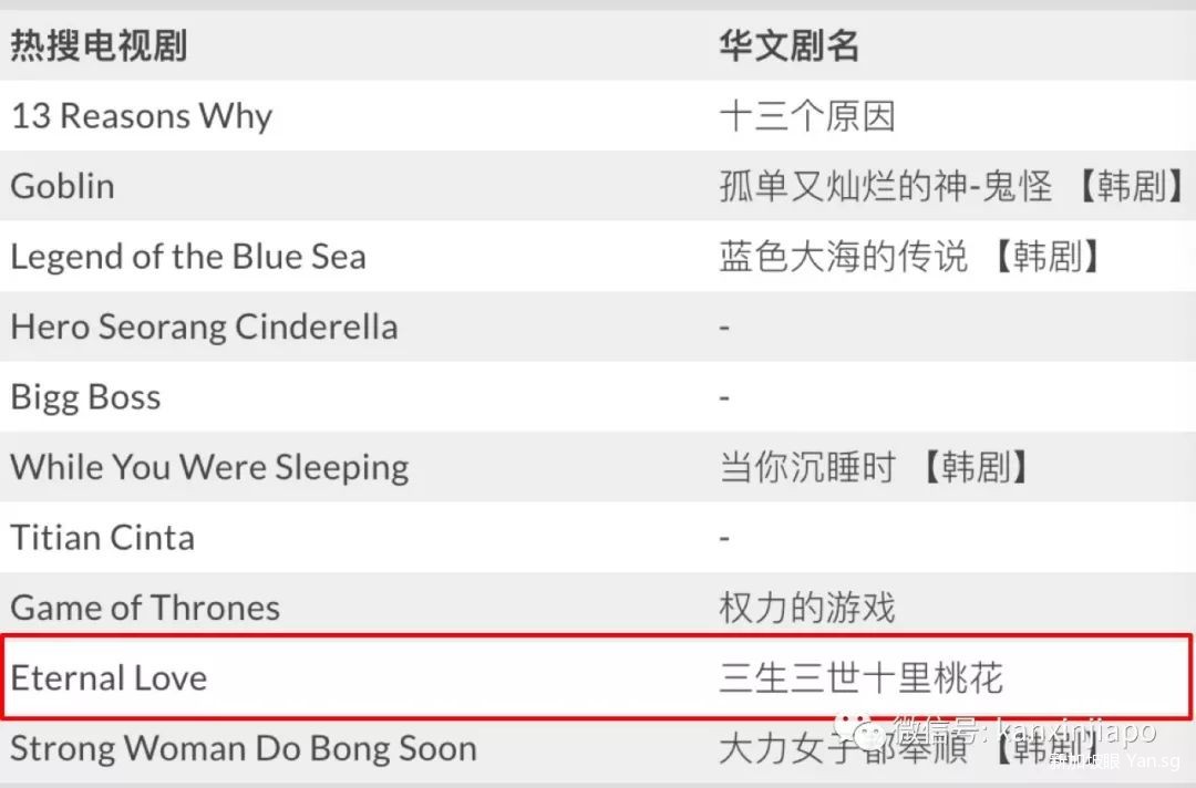 《三生三世十里桃花》在新加坡有多火?2017年十大热搜电视剧榜单中,《桃花》排在第九,是首部上榜的中国大陆剧!2018年杨幂和阮经天合作的《扶摇》,虽不及《桃花》热,但也成为了新加坡谷歌热搜剧。