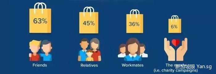 新加坡人送礼对象首选是朋友,63%的受访者为朋友购买了礼物。其次是亲戚与朋友,分别占调查总人数的45%与36%。