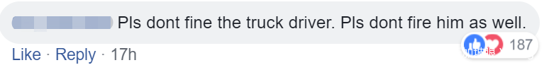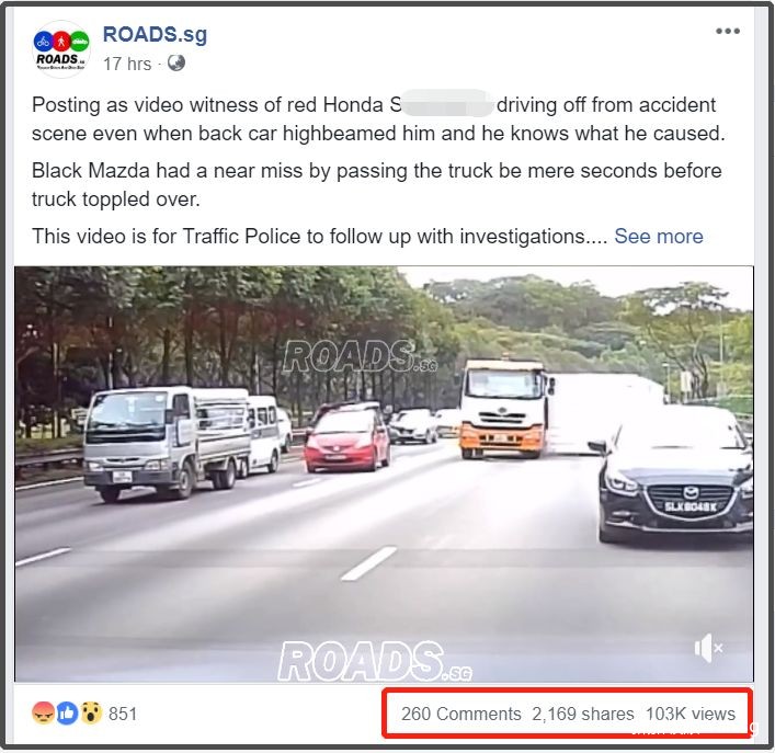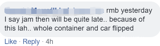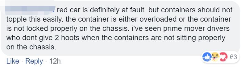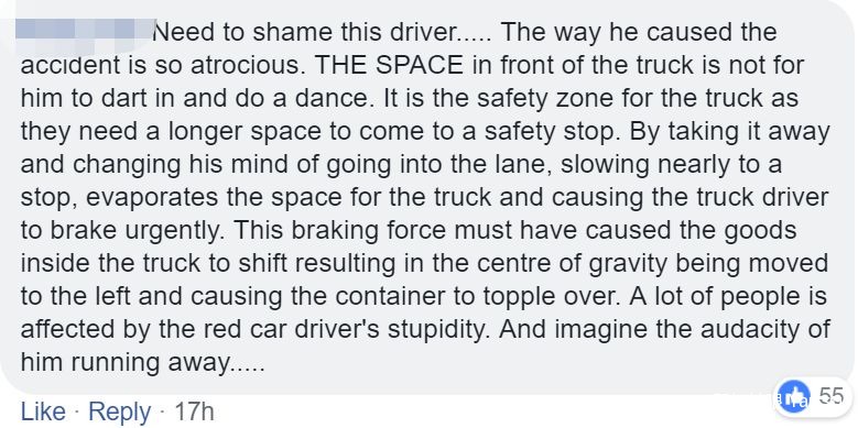 (这个(红色轿车)司机简直差透了。卡车前面的空间不是让他超车的,那是卡车的安全区域,因为卡车需要更长的时间安全地停下来。红色轿车任意换车道,让卡车根本没空间减速,只能紧急刹车。刹车的冲击力导致卡车内的货物移动,让车的重心偏左,导致容器翻倒。很多人都因为红色轿车司机的愚蠢而受影响。没想到他居然还有胆逃跑…..)