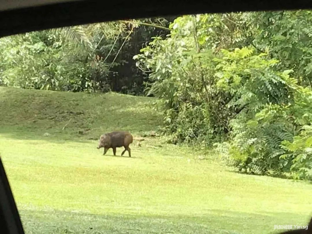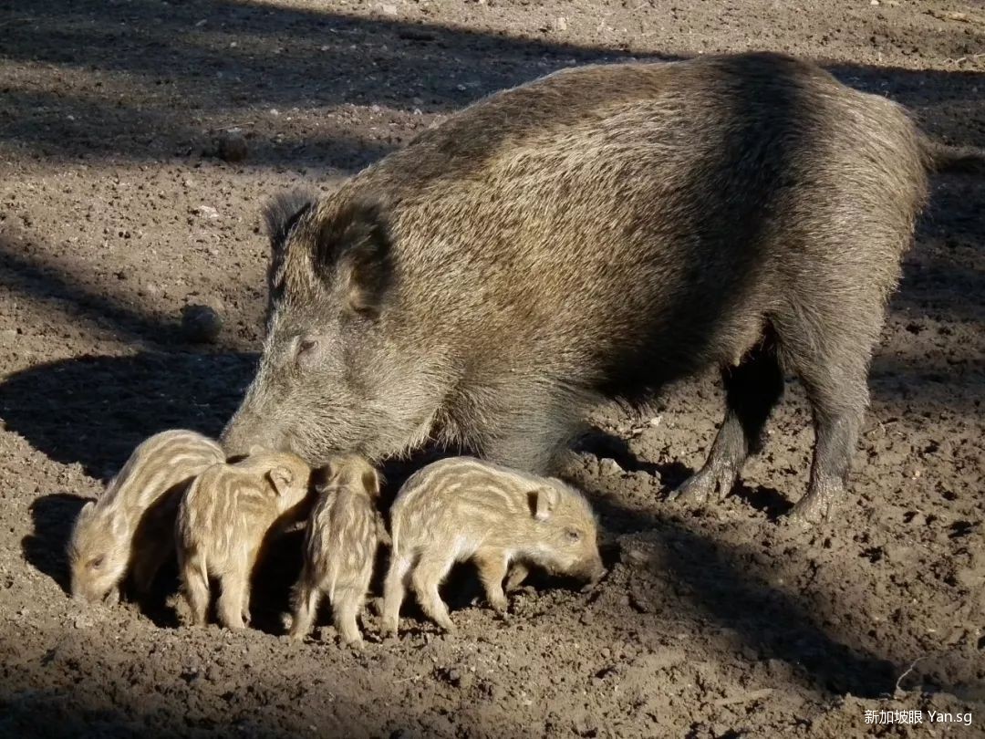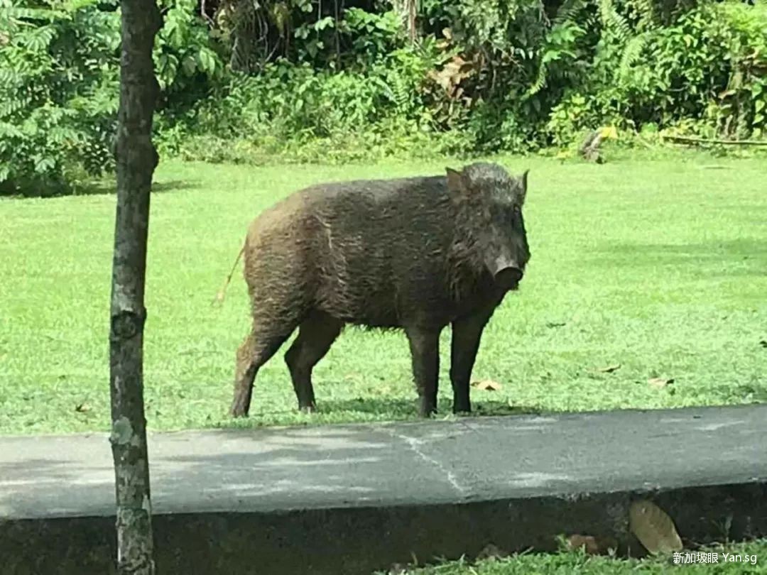 野猪在新加坡很常见,属于群居动物,生性凶猛、攻击性强,当受到威胁时,公猪会用獠牙来保护自己,没有獠牙的母猪会咬对方。