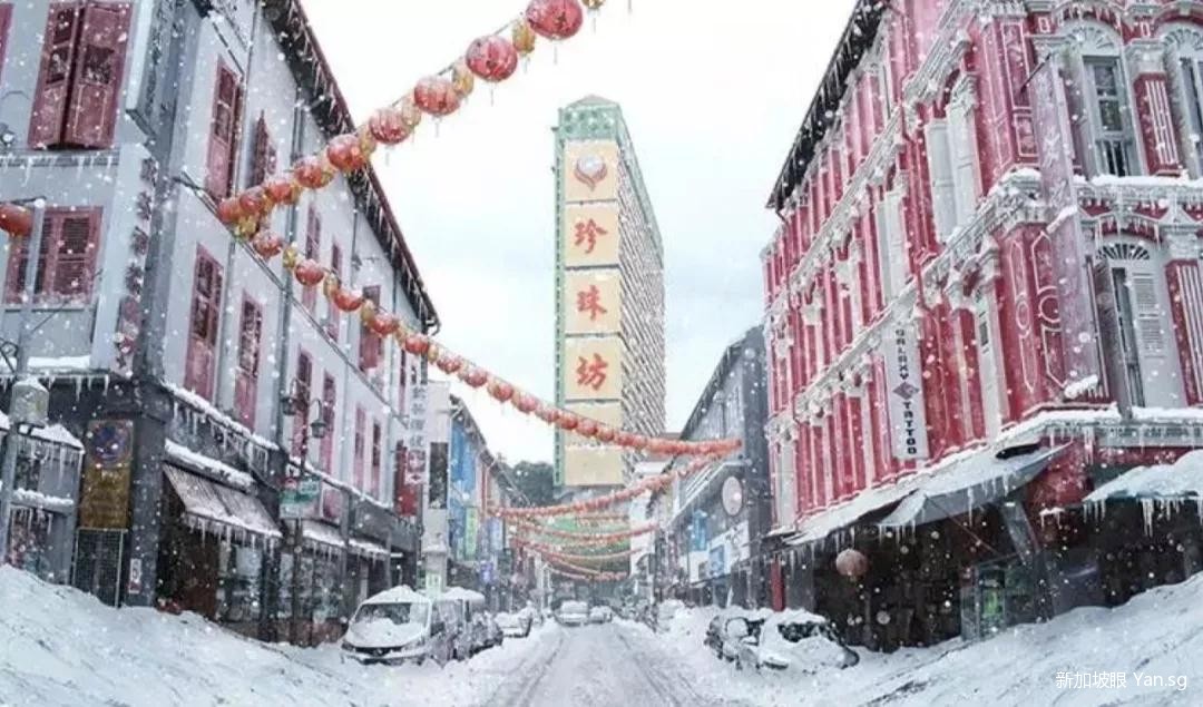 白雪皑皑的珍珠坊 (People’s Park Complex),配合上这张灯结彩的装饰,竟有种在中国过春节的意境。