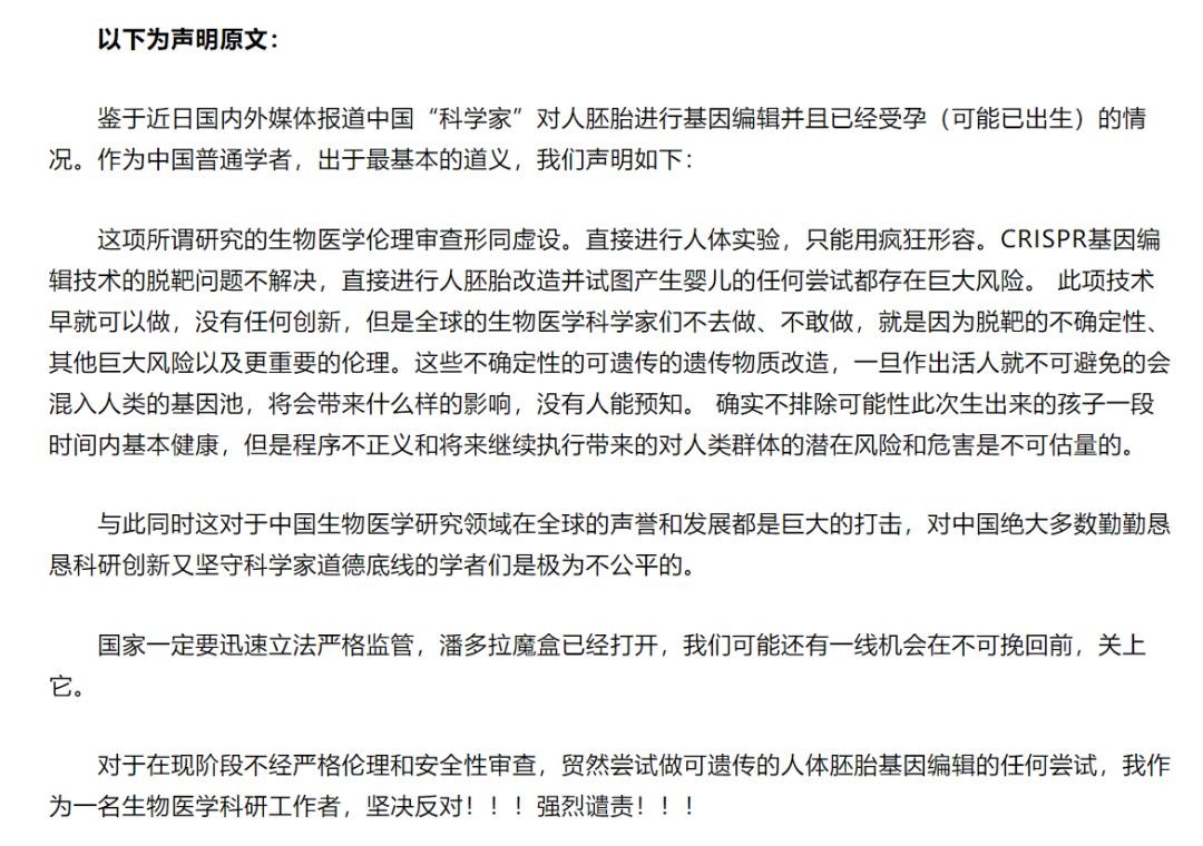 新加坡A*STAR(新加坡科技研究局)研究员傅玉还签署了全球112名科学家的联合声明,强烈谴责基因编辑。