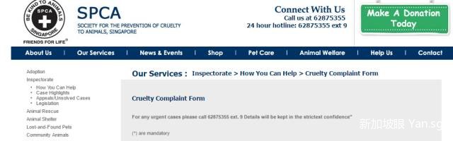 同时,在新加坡,虐猫虐狗也是罪行!除了报警之外,大家也可以到SPCA(防止虐待动物协会)投诉。网址:http://www.spca.org.sg/form_crueltycomplaint.asp