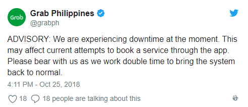 菲律宾Grab的推特账号,在下午4点po文称正在全力解决APP的故障。