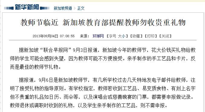 既然学校都放假庆祝了,作为家长和学生,也不能不表示表示。接下来,是家长们最关心的话题了?送礼送什么?话说“入乡随俗”,新加坡政府素来以廉洁著称,而新加坡教师属于公务员,那么收礼也是要严格服从本地法律。也有不知情的家长送礼送到让老师为难。