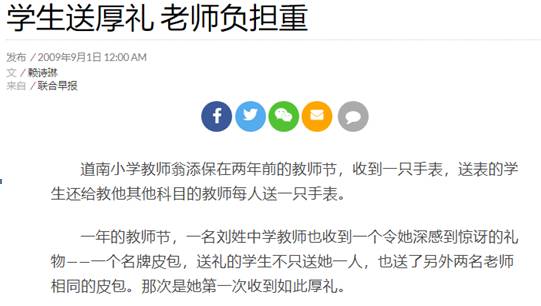 另有学校老师说他知道曾经有个中学的老师和某同事关系不好,结果教师节收了学生一大盒礼品(20左右),结果被同事举报了,然后就被叫去MOE喝茶了。