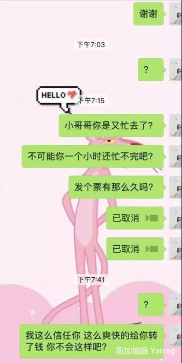 没想到在新加坡也会受到这样的网络诈骗,希望新加坡眼可以帮助我们人肉他,钱我不指望找回来了,只是不希望让更多人受骗。